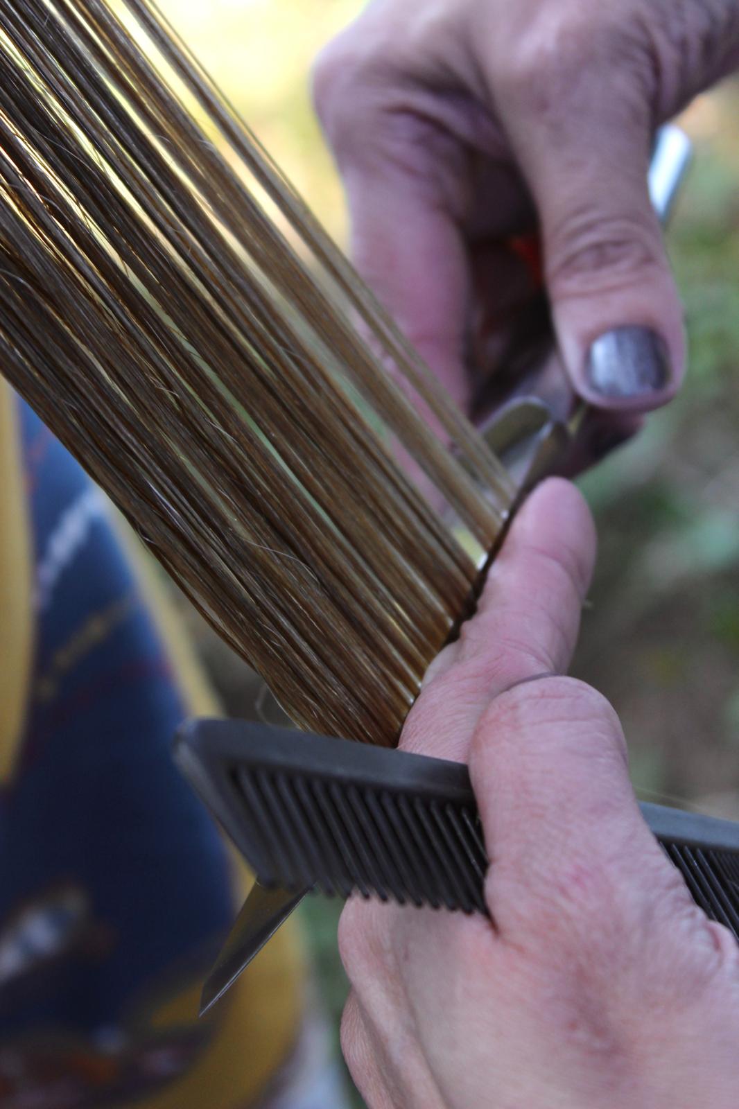 La coupe énergétique peut alors commencer. Je prends une mèche de vos cheveux que je tiens délicatement entre mes doigts, puis j'utilise le tantō pour couper. Ce geste peut provoquer un ressenti subtil, comme un frisson, une émotion qui remonte ou une sensation de légèreté. Cette expérience est tout à fait normale et invite à la libération intérieure.