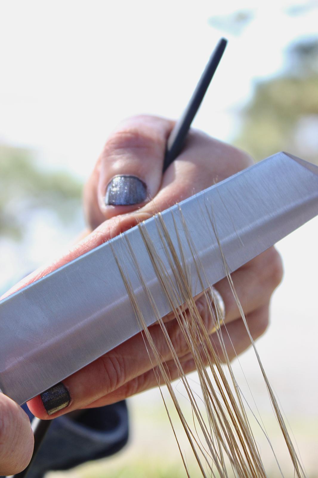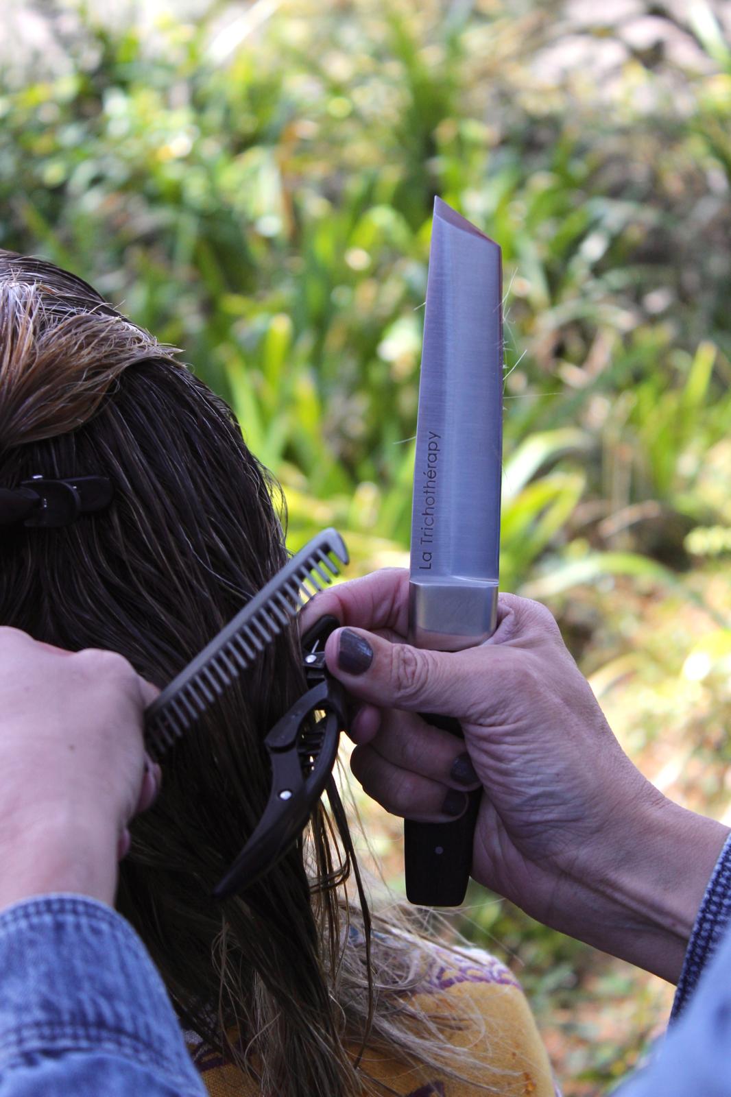 Elle se pratique à l’aide d’un tantō, un petit sabre japonais, utilisé ici comme un outil subtil et sacré. La coupe se fait mèche par mèche, dans un écoute profonde du cheveu et de la personne. Chaque geste vise à libérer les tensions, à faire circuler l’énergie et à révéler la beauté naturelle, en résonance avec l’identité profonde.